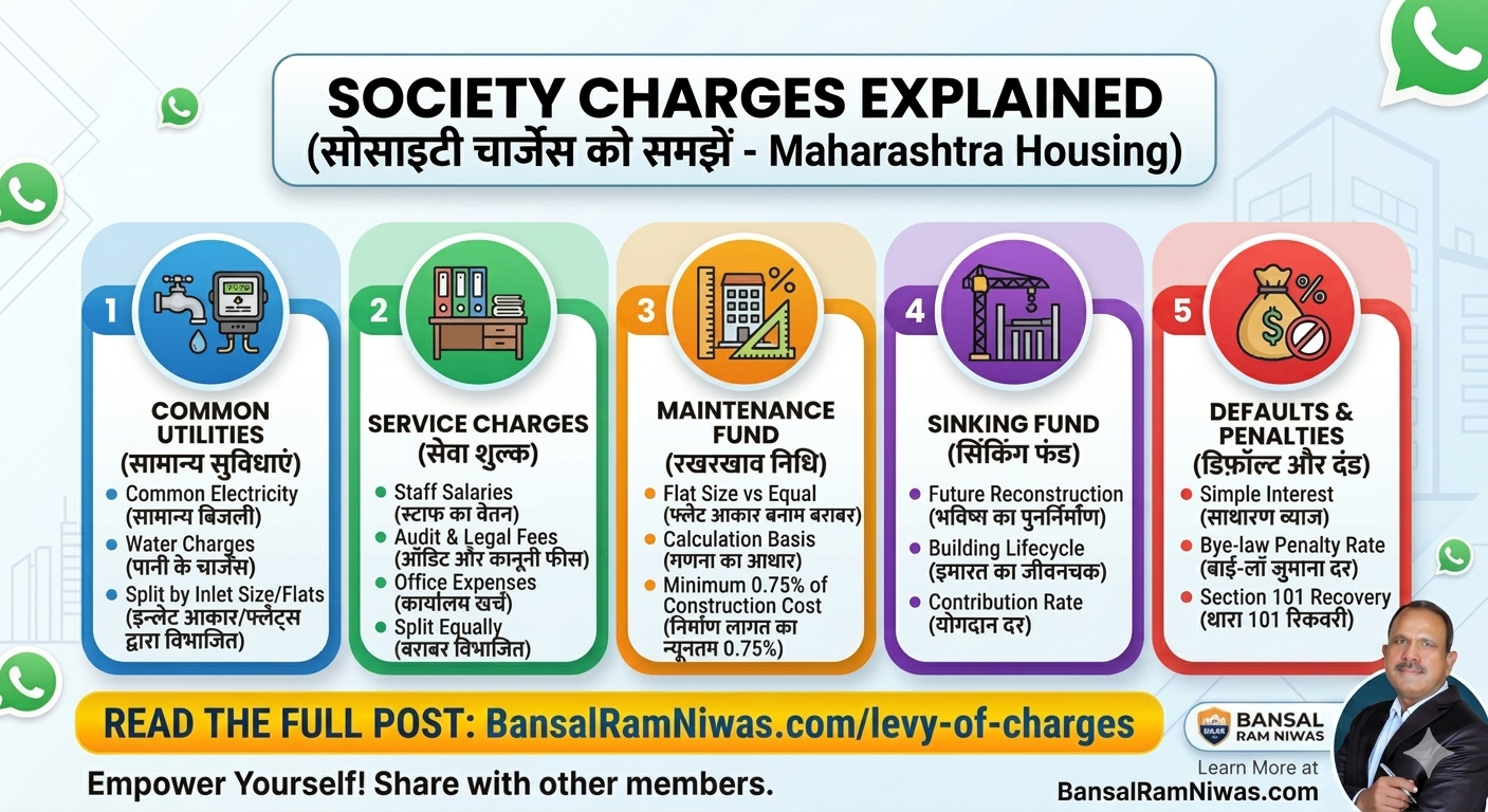 Levy of charges by Housing Societies: For many residents in Maharashtra, the monthly maintenance bill from their Co-operative Housing Society (CHS) can often seem like a confusing list of figures. However, these charges are not arbitrary. They are strictly governed by the Maharashtra Co-operative Societies Act and the specific Model Bye-laws adopted by the society.