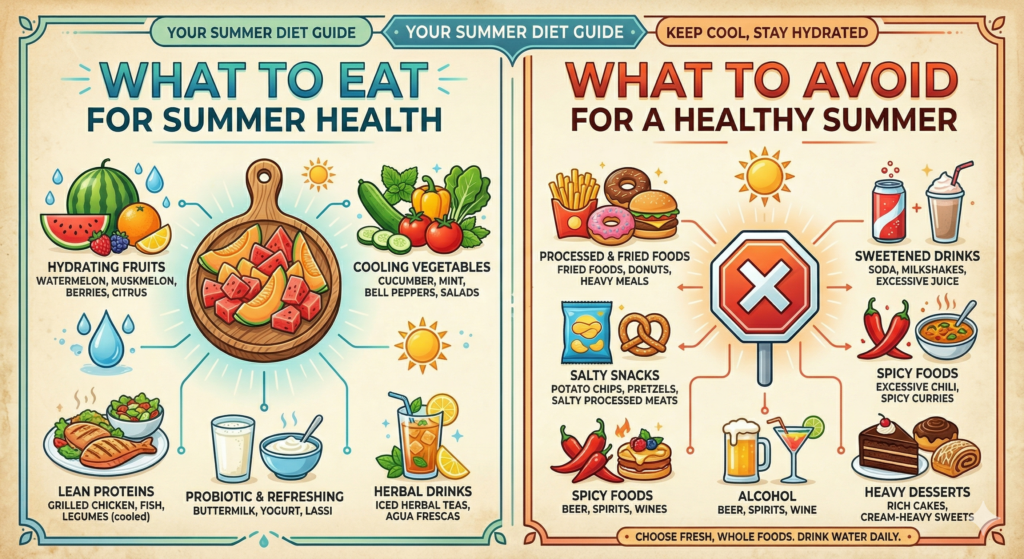 - Shift Your Proportions: Naturally move towards a diet that is heavily based on fruits and vegetables, reducing the volume of heavy grains, proteins, and dairy, especially during the peak daytime heat.